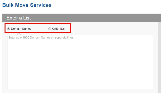 Enter a list of Domain Names or Order IDs you want to move. You can mention upto 1000 Domain Names or Order IDs on separate lines.